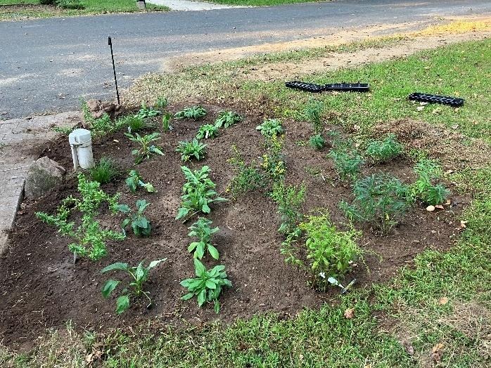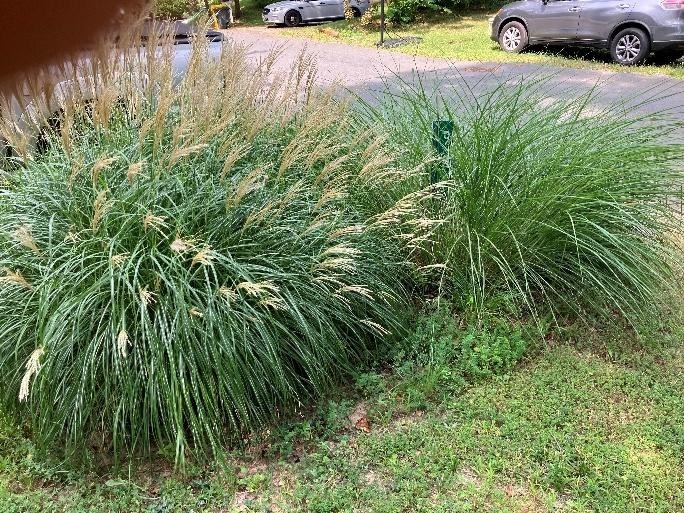Non-native miscanthus (tall grasses) replaced with young native coneflowers, black- eyed susans, milkweed, and asters: